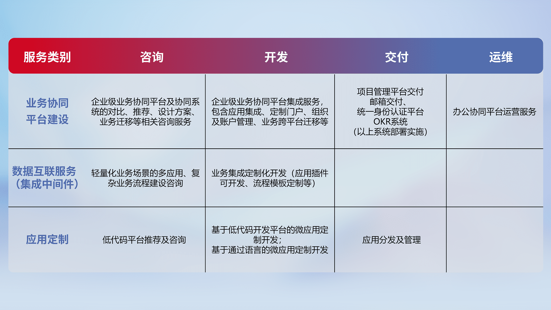 针对钉钉、、企微、、、IDaas等平台级产品提供产品的规划、、方案、、、、交付、、、、定制化开发等服务,,实现如统一协同办公、、智能客户服务、、、、混合会议管理、、、、智能数据查询、、、等业务场景,,,,实现数字化转型。。